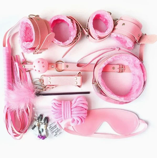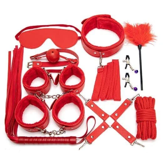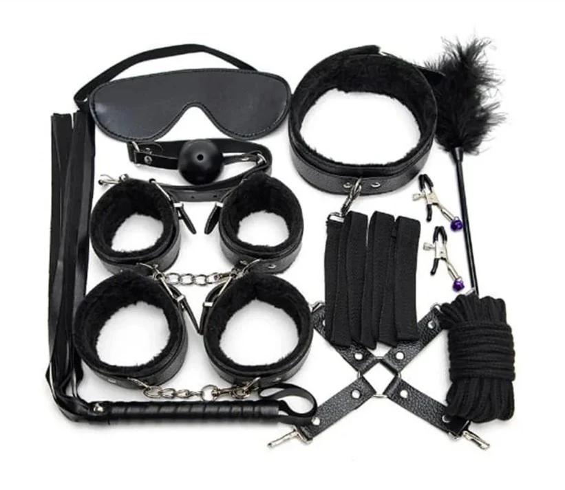 Variety of Pieces: Includes a halter neck bra, high-waisted panty, choker, and other accessories like cuffs or leg harnesses. Some sets also come with a whip or blindfold.